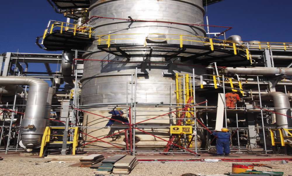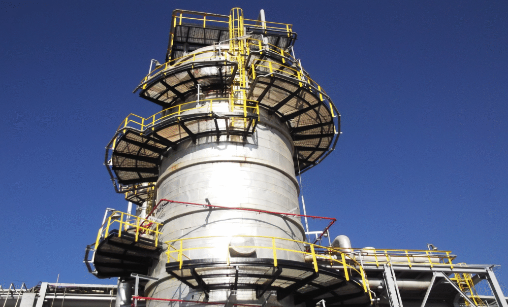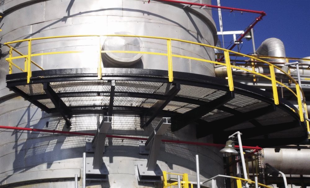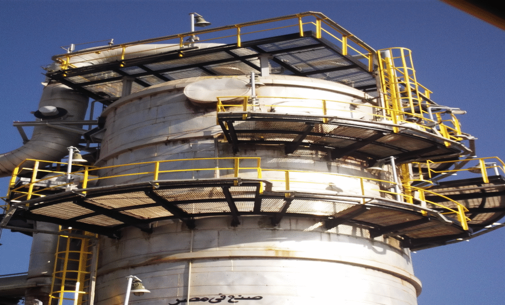 Full repair of the absorber’s external steel structure. The scope of work included the dismantling of all corroded platforms and the erection of new ones, including supports, main beams, ladders, and handrails. Additionally, the supports (such as cable trays, FFs, instruments... etc.) were reconnected to the new platforms after erection.